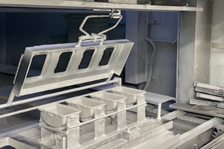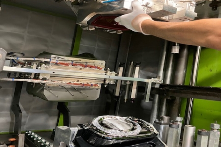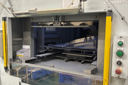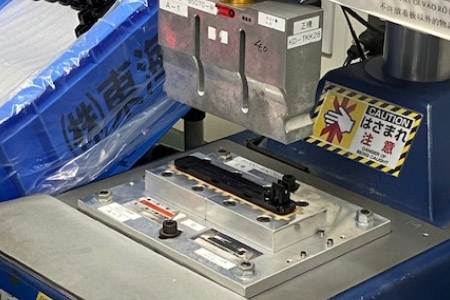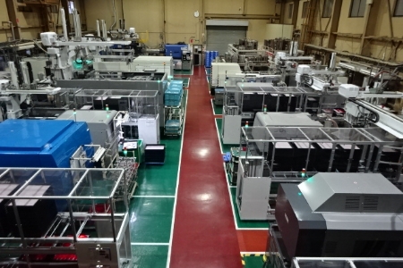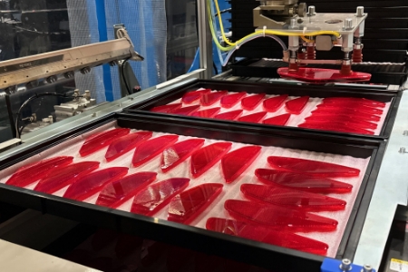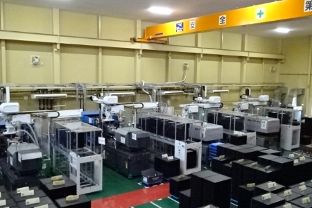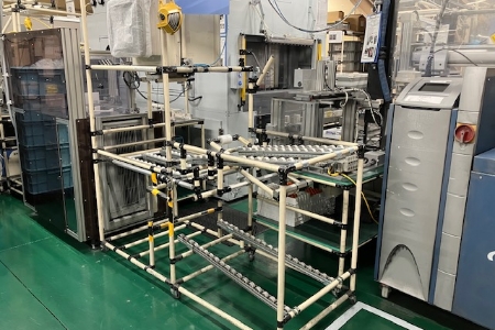 成形後に取り出し機より製品を直接トレーに並べ、R/Lの区分、員数管理、梱包を行うオートストッカーを導入し省人化に取り組んでいます。