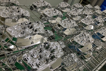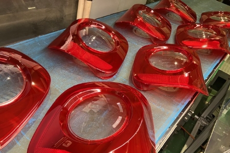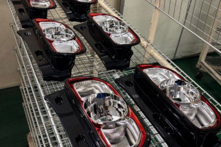 『塗装+組立』『成形+蒸着』といった一貫作業によって効率的な生産及び安価なものづくりができるよう取り組んでいます。アルミ蒸着品のカラートップコートを行うことにより、付加価値の高いモノづくりが可能です。
